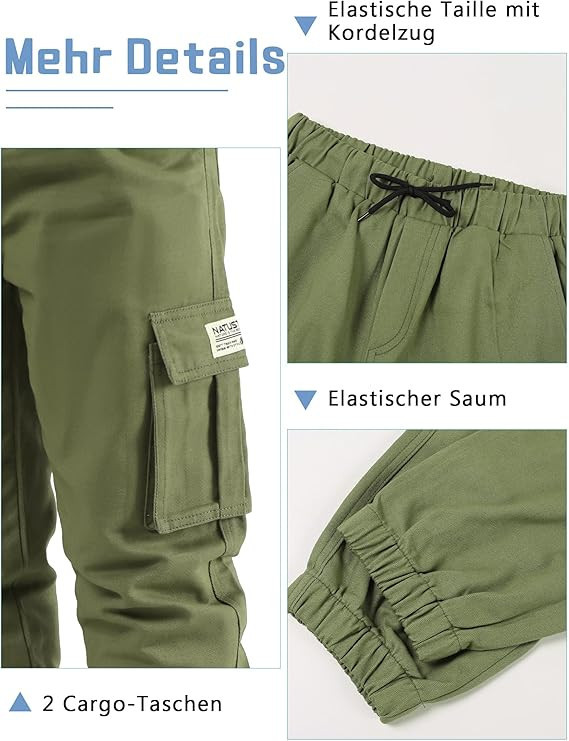 A NATUST unisex cargo nadrág ideális választás fiúknak és lányoknak egyaránt, akik kényelmes, mégis divatos szabadidőnadrágot keresnek. A nadrág 100% pamut anyagból készült, amely puha tapintású, jól szellőzik és strapabíró, így tökéletes a mindennapi viselethez, iskolába vagy aktív szabadidős programokhoz.
