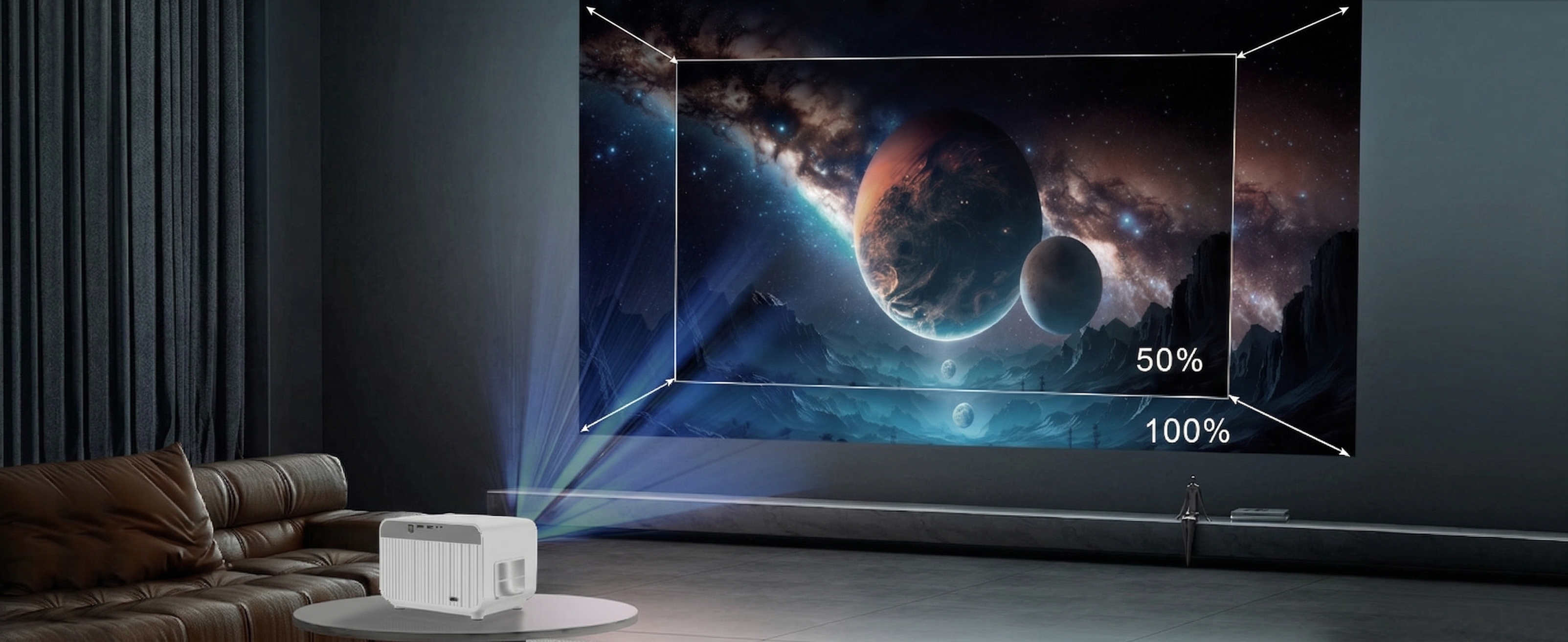 A 50%–100% zoom segítségével a kép méretét egyszerűen állíthatod anélkül, hogy a projektort mozgatnád. Ideális kisebb és nagyobb helyiségekhez is.