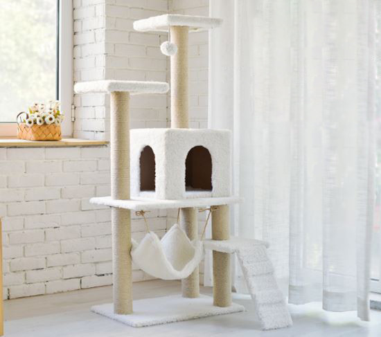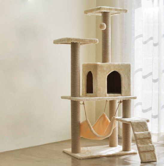 Kaparófa bézs, több szintes hittanággyal. Plüss borítással. Kiscicák és felnőtt macskák részére is. Az oszlopok kaparható felülettel vannak ellátva. Stabil, vastag lapok.