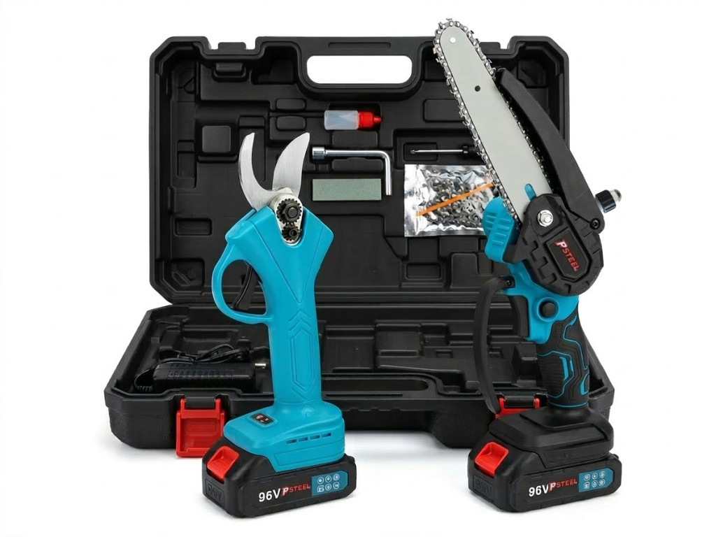 PSteel Akkumulátoros Ágvágó Láncfűrész és Metszőolló Szett két akkumulátorral – 96V