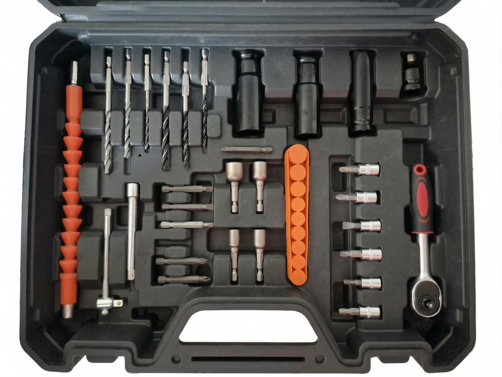 A készlethez tartozó praktikus hordtáska számos kiegészítőt tartalmaz: különböző bitfejeket, fúrószárakat, dugókulcsokat, hosszabbítókat és egy racsnis kulcsot is. Ezek segítségével a legtöbb szerelési feladat könnyedén elvégezhető egyetlen szerszámkészlettel.