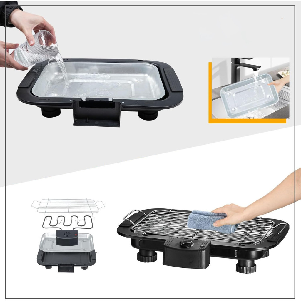 A beépített zsírfelfogó tálcát főzés előtt vízzel lehet feltölteni, majd használat után a zsírt tartalmazó vizet kiöntve könnyen elvégezhető a tisztítás. A rozsdamentes grillsütőrács mosogatógépben mosható, és minden más alkatrész is levehető és folyó vízzel elmosható – kivéve a fűtőelemet, amelyhez hálózati kábel csatlakozik. Ezt csak töröld le tisztításkor.