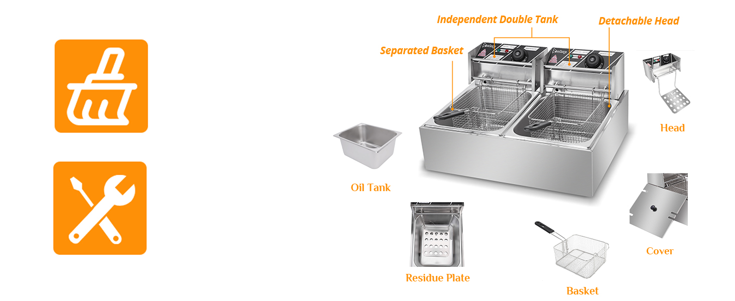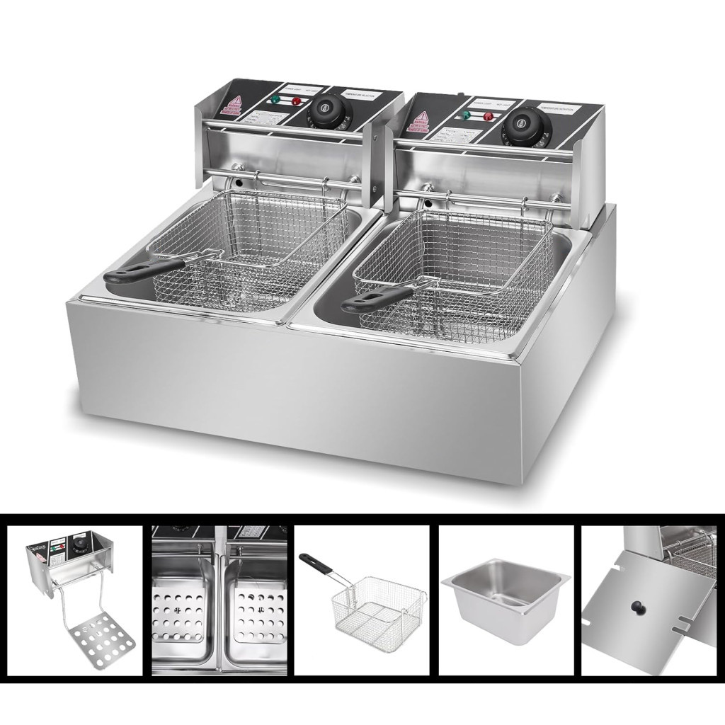 Ez a 12 liter kapacitású elektromos olajsütő két különálló sütőtartállyal rendelkezik, melyek egyenként 6 liter űrtartalmúak. A két tartály egymástól függetlenül szabályozható, így egyszerre különböző hőmérsékleten süthetők eltérő ételek. A hőmérséklet 60 °C és 200 °C között állítható, maximális rugalmasságot biztosítva a sütés során.