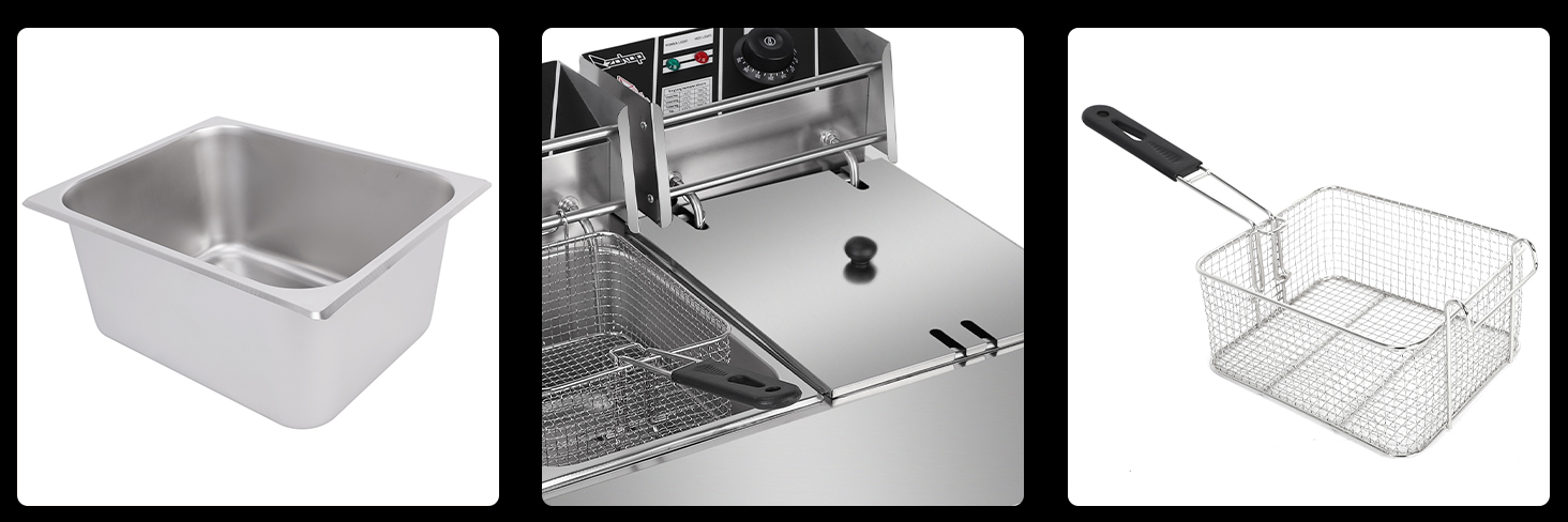 A stabil, négy lábon álló asztali kivitel biztos tartást nyújt használat közben. A sütőkosarak hőszigetelt fogantyúval vannak ellátva, melyek megakadályozzák a kéz megégését. A fedél csökkenti az olaj kifröccsenését, így a készülék használata biztonságos és kényelmes.