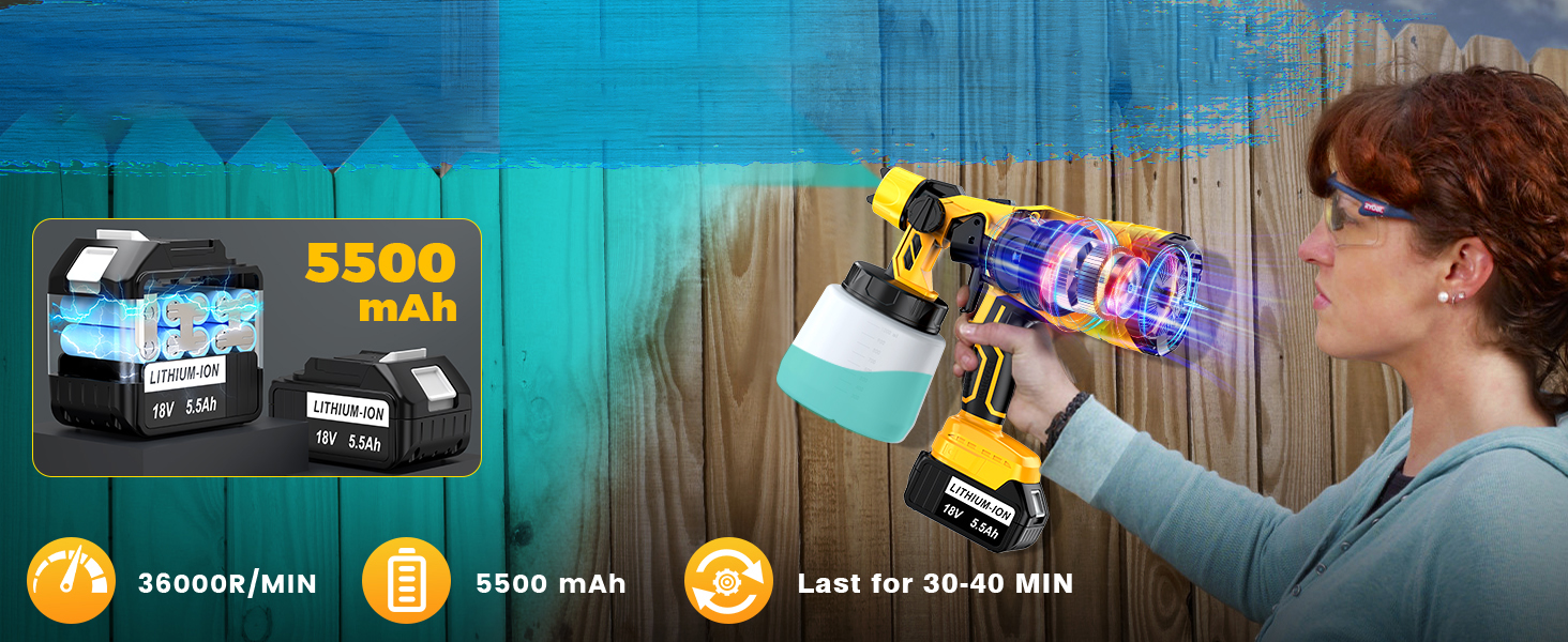Az akkumulátoros festékszóró két darab 24V-os, 5500 mAh kapacitású tölthető akkumulátorral érkezik. A két akkumulátor együtt akár kb. 40 perc folyamatos munkavégzést biztosít, ami elegendő a legtöbb festési feladathoz. A vezeték nélküli kialakítás nagyobb mozgásszabadságot és kényelmet nyújt, hiszen nem kell hosszabbítókkal vagy hálózati csatlakozással bajlódni.
