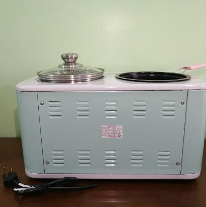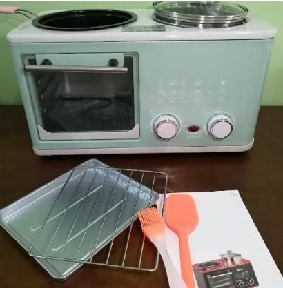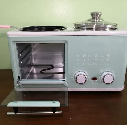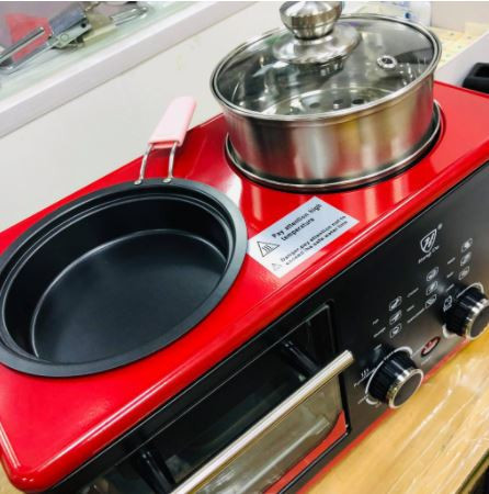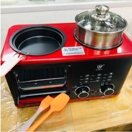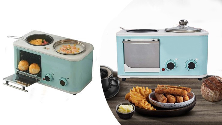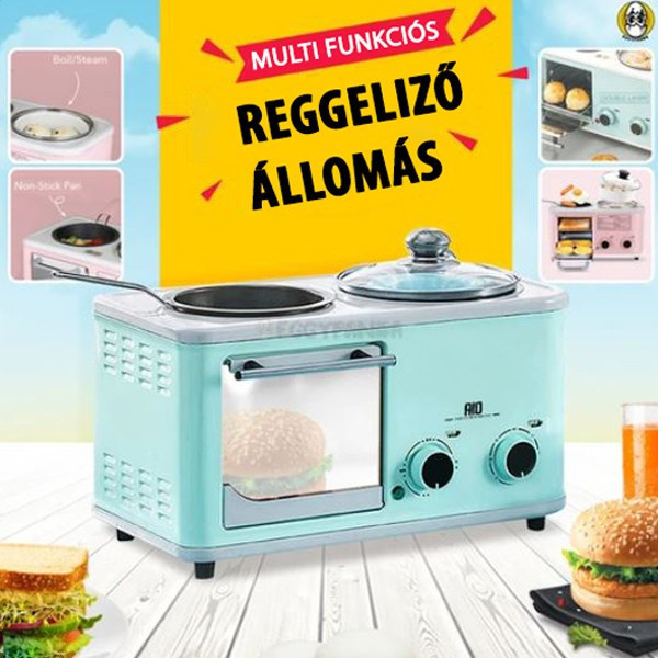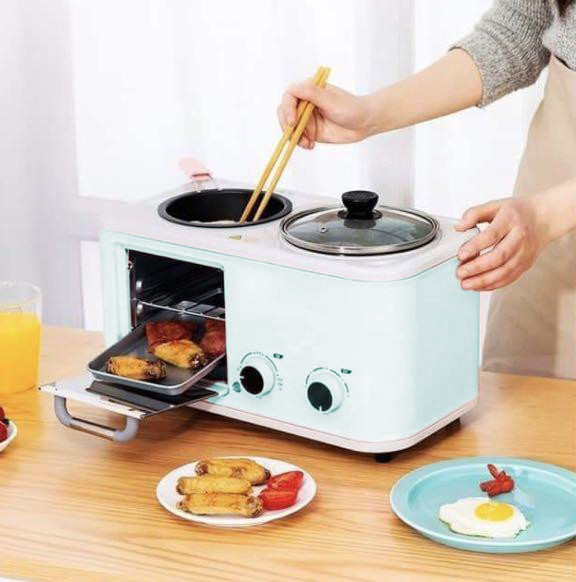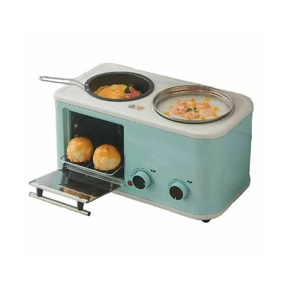 Multifunctional 3 in 1 breakfast maker with grill function, built-in cooking pot, bread and bacon toaster.