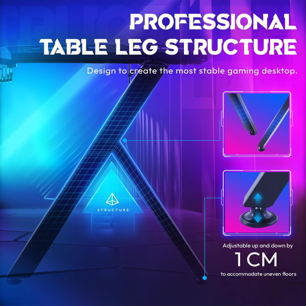 A Dowinx gamer asztal többszögű (multi-triangle) szerkezeti kialakítással készült, amely egyenletesen osztja el a terhelést.