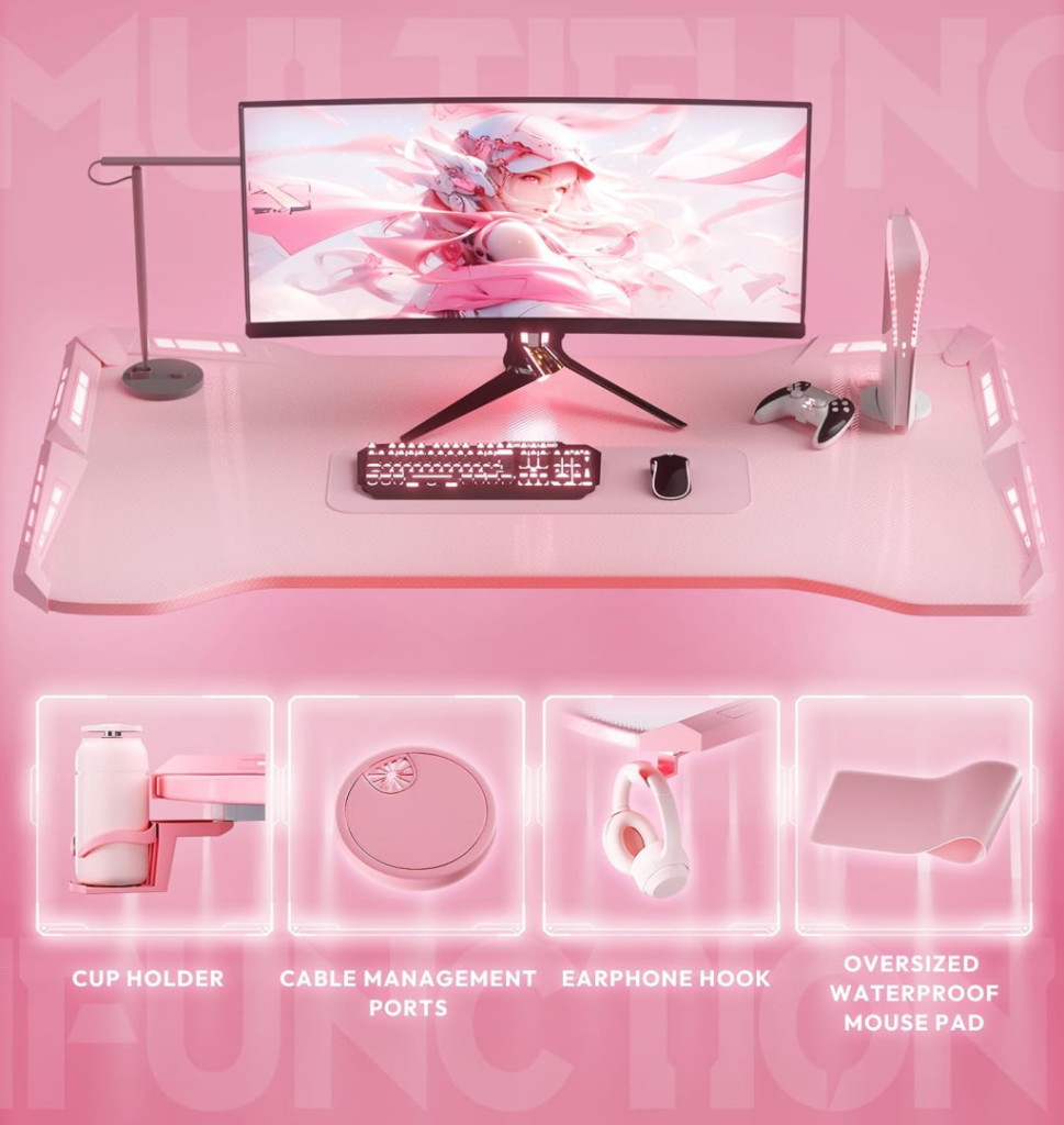 Dowinx RGB Gamer számítógépasztal, 120x60 cm, pink- Pohártartó, fejhallgató tartó, távirányító