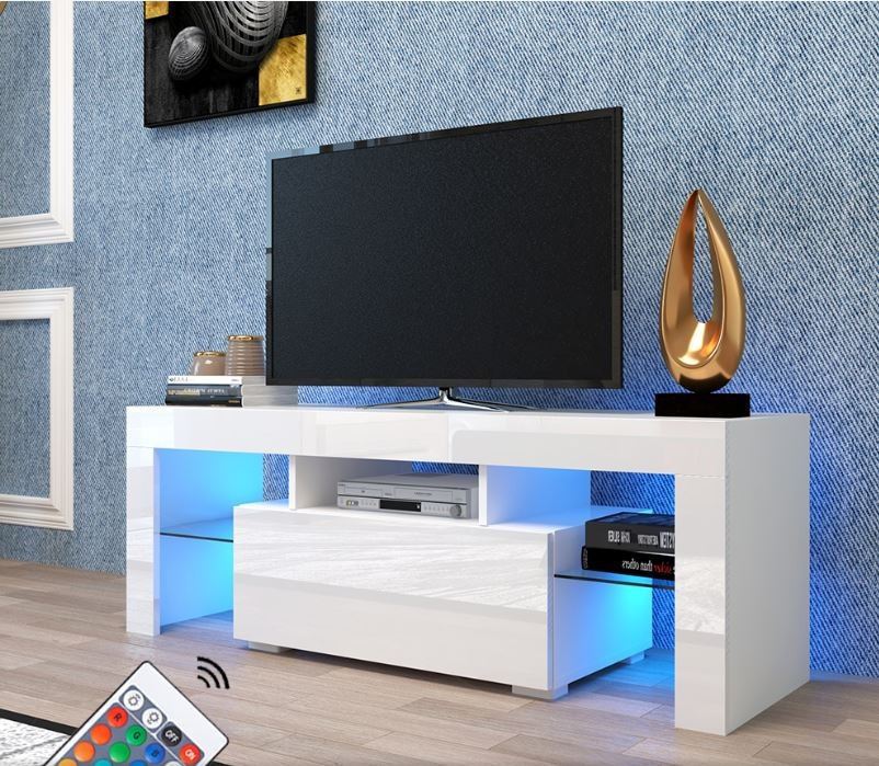 A szórakoztató központ TV-állványa 12 színű LED világító rendszerrel rendelkezik. Távolról vezérelheti a színeket, valamit ki és be is kapcsolhatja őket. Alkalmas akár 65 hüvelykes, azaz 160 cm képátlójú TV-khez. Pompázhat a nappali vagy a hálószoba díszeként.