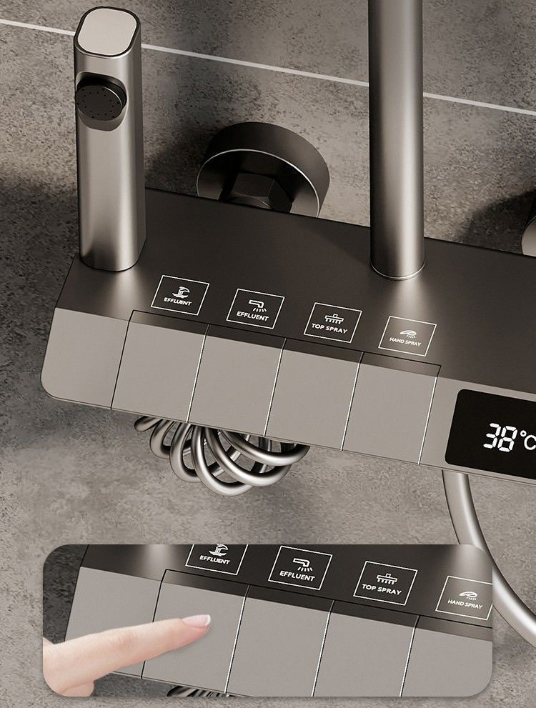 A zuhanyrendszer beépített digitális kijelzővel rendelkezik, amely valós időben mutatja a víz hőmérsékletét. Ez nemcsak kényelmes, hanem biztonságos is, hiszen pontosan beállítható az ideális hőfok – különösen hasznos gyermekes családok számára.