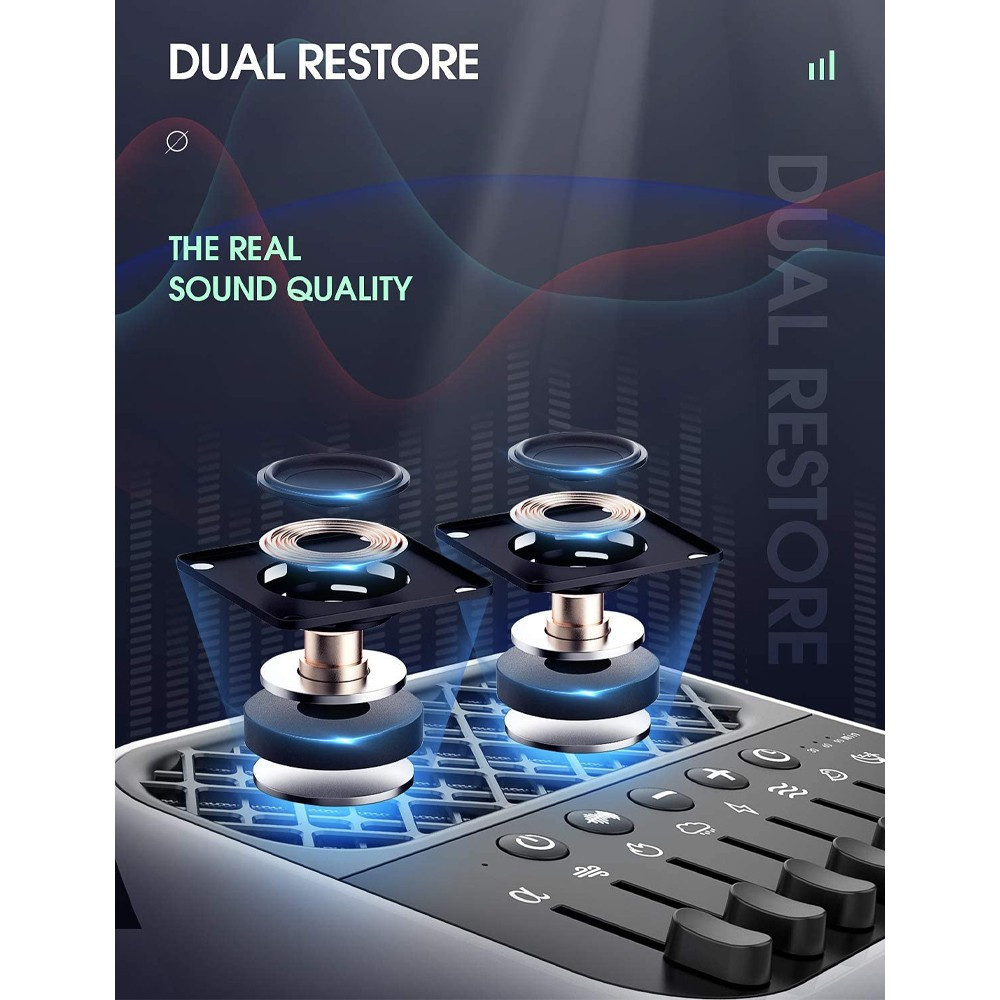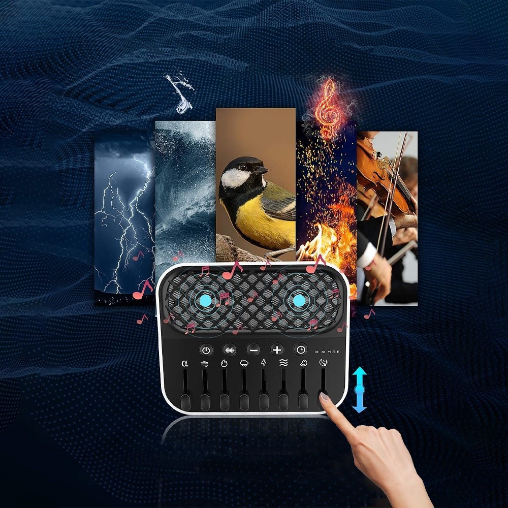 A Fehér zaj gép segít kizárni a zavaró tényezőket, és tökéletes környezetet teremt az alváshoz, a pihenéshez vagy a koncentrációhoz. 24 megnyugtató hang együttes elhelyezése, beleértve a fehér zajt, a ventilátort, a mennydörgést, a folyót, a madárdalt, az esőt, a nyári éjszakát, a lángokat, az alvó zenét. Tetszés szerint állítható be a hangerő. Az automatikus kikapcsolási időzítő 30, 60 és 90 perces opciókat tartalmaz. Könnyű, könnyen hordozható, és tökéletes utazáshoz.