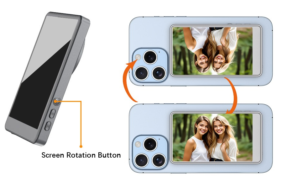 A képernyőforgató gombbal gyorsan megfordíthatod a kijelző képét anélkül, hogy újra és újra szét kellene szerelned a szelfikijelzőt.